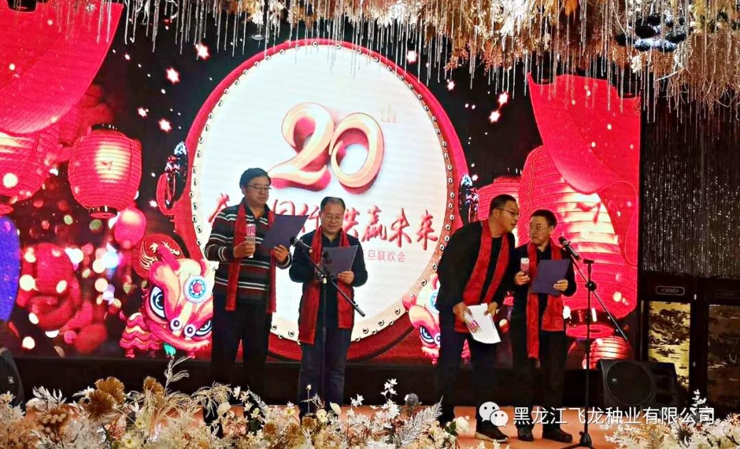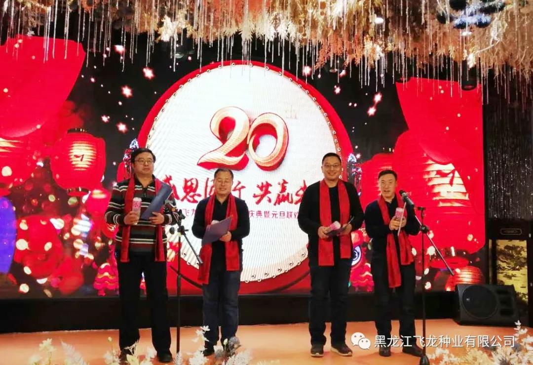 風(fēng)雨砥礪,歲月如歌,2020年1月1日,黑龍江飛龍種業(yè)有限公司20周年慶典暨元旦聯(lián)歡會圓滿舉行,全體飛龍人與各科研院所專家、以及來自各地的七十多位種地大戶歡聚一堂,共度佳節(jié)。其中到場的嘉賓分別有:飛龍種業(yè)首席大豆育種專家杜維廣研究員(左6)、牡丹江農(nóng)科院任海祥院長(右4)、農(nóng)墾科學(xué)院大豆所王德亮主任一行(左4)。